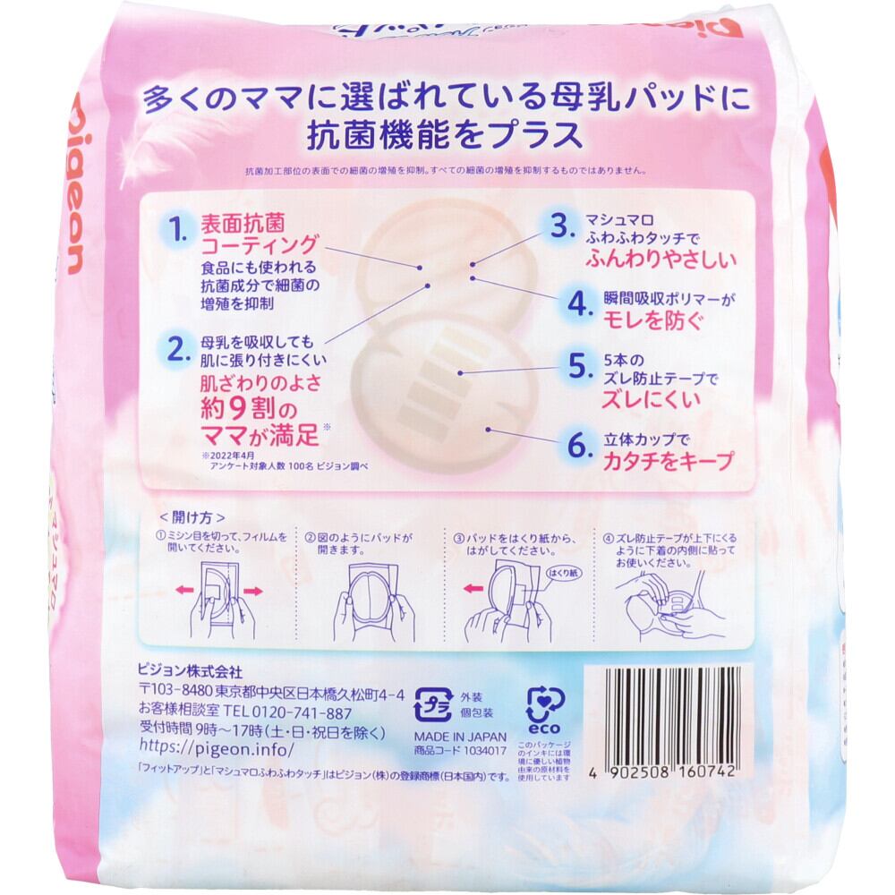 【限定セール開催中】→ https://mukimei.kannonsama.com マシュマロふわふわタッチ食品にも使われる抗菌成分・ポリジン配合●抗菌加工部位の表面での細菌の増殖を抑制。※すべての細菌の増殖を抑制するものではありません。●マシュマロふわふわタッチなクッション性のあるシートでふんわりやさしくお胸を包み込みます。●立体カップがヨレや型くずれを防ぎ、最後までカタチをキープ。モレの心配がありません。●母乳専用の瞬間吸収ポリマーでたっぷり母乳もしっかりキャッチします。母乳を瞬時に引き込むスピード吸収シートで、ムレずにさらさら実感。肌ざわりの良さ約9割のママが満足。※2022年4月 アンケート対象人数100名 ピジョン調べ●5本のズレ防止テープ付きで、ズレにくい。●衛生的で交換しやすい1枚ずつの個包装タイプ。【開け方】(1)ミシン目を切って、フィルムを開いてください。(2)パッドが開きます。(3)パッドをはくり紙からはがしてください。(4)ズレ防止テープが上下にくるように下着の内側に貼ってお使いください。【注意】・母乳パッドは授乳のたびにお取り替えください。また量が多いときは、随時交換してください。・お肌に合わないときはご使用を中止し、医師にご相談ください。・トイレなどに流さないでください。・お子様の手の届かないところに保管し、ご使用後はすぐに処分してください。※ご使用に際しては、お子様の誤飲・誤食にご注意ください。・原材料のにおいが感じられる場合がありますが、品質には問題ありません。・直射日光の当たる場所や、高温のところには保管しないでください。★母乳パッドは「授乳ごと」に替えていただくことがおすすめです。パッドの表面を抗菌加工した母乳パッドですが、すべての菌の繁殖を防ぐものではありません。長時間交換しない母乳パッドの中では、母乳の量に関わらず、雑菌が繁殖してしまうリスクも。赤ちゃんとママのためには授乳ごとの交換がとても大切です。